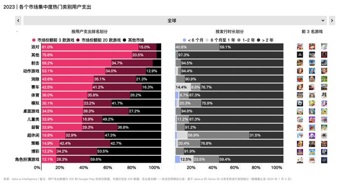 派对、射击与动作类游戏用户支出表现最为集中,头部 20 款游戏占据了全球市场份额的 80% 以上。而 Coin Master 、Monopoly GO 以及 Eggy Party(蛋仔派对)更是攫取了派对游戏市场 81% 的用户支出。竞争相对更为激烈的角色扮演、博彩以及超休闲品类用户支出集中度则低得多。