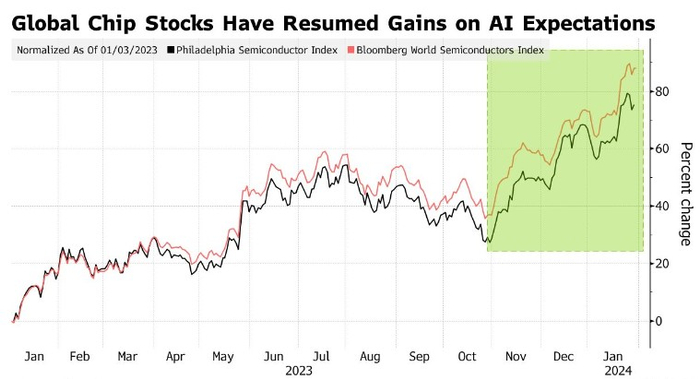包括智能手机芯片制造商高通公司(QCOM.US)周三和人工智能芯片之王英伟达公司(NVDA.US)将于2月21日公布的财报在内将为本轮上涨提供进一步线索。本轮上涨已将芯片股基准推至历史最高水平。费城半导体指数自10月底以来已上涨34%,是标普500指数涨幅的两倍。