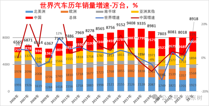 从主力国家代表的世界销量看,2018年的世界汽车销量下降1%。自2010年以来首次陷入年度负增长。2019年的汽车销量8981万台,同比下降4%,稍好于2008年的下滑幅度;2020年的销量下滑13%;2021年同比回升4%;2022年的世界销量下降1%的表现较差;2023年的世界销量增速11%的表现较好,其中中国增12%,世界其它国家增11%。虽然今年的中国车市年初的暂时调整拉低增速,但下半年表现很好。