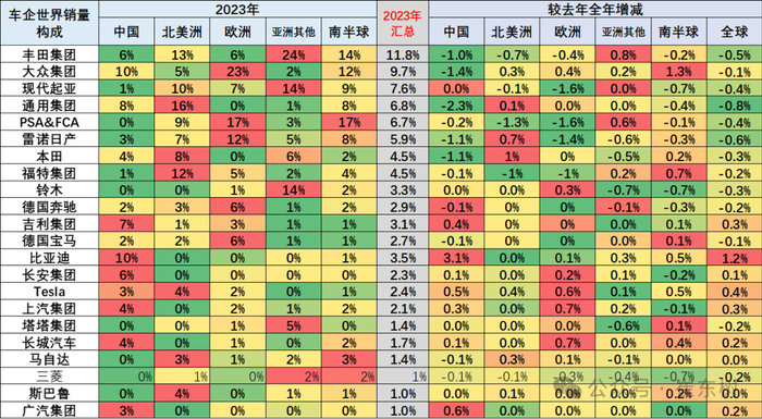 除了特斯拉,国际品牌份额全面下滑。丰田集团表现相对稍弱,较去年下降0.5个百分点,2023年在世界份额已经达到11.8%左右的水平,但东南亚市场总体表现较强。