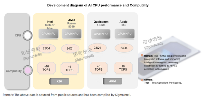 伴随着AIGC的发展,算力逐渐向端侧倾,CPU+NPU+GPU已成为AI PC的主要布局方向,从而为AI应用提供强大的算力支持。特别是ARM架构CPU在计算能力方面具有优势,预计将在2024年获市场份额的增长。