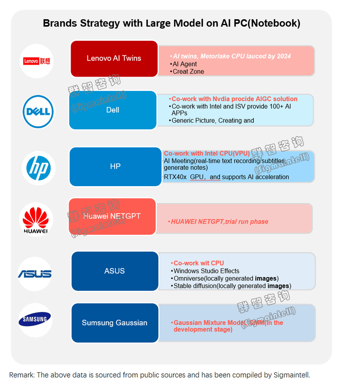 AI PC应对这些挑战的能力,在很大程度上取决于各品牌的自研实力。这不仅涉及到硬件层面的技术突破,也涉及到软件生态的适配和优化。群智咨询研究发现,目前围绕端侧大模型的探索,PC品牌的发展基础、投入规模与策略选择方案具有差异性。一部分品牌在AI PC领域展现出积极态度并取得一定成效,试图对AI PC的发展起到引领作用。也有一部分品牌在应用场景和布局上稍显迟滞,面临同质化风险。群智咨询认为当AI PC开启了产业新一轮发展风口的同时,因品牌策略与能力所导致的品牌竞争格局也将同步进入深度调整期。