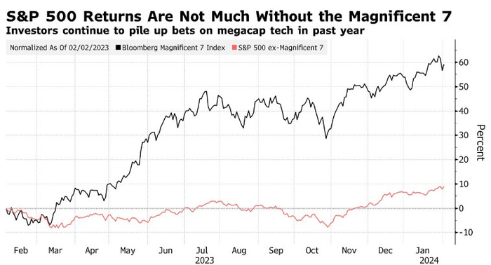 Hartnett指出,75%的投资者预计美国经济会软着陆,20%的投资者预计不会着陆。不过,他说,虽然软着陆应该会支撑更广泛的股票涨势,但“壮丽七雄”在1月份的标普500指数回报率中占45%,反映出“倾向于不着陆/不泡沫”。