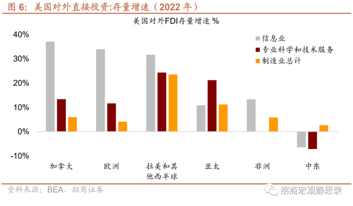 分地区看,2022年美国信息业对外直接投资在加拿大(37.0%)、欧洲(34.0%)、拉美地区(31.7%)的增速最快;科学技术服务业对外直接投资在拉美(24.3%)、亚太(21.2%)的增速较高;制造业对外直接投资在拉美(23.5%)的增速较高。
