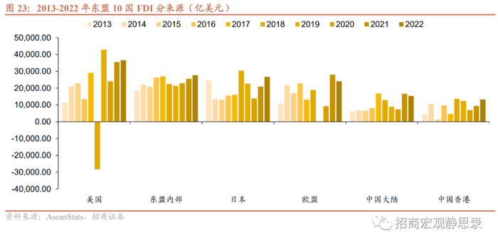 由于数据制约,我们将东盟10国看成一个整体。从投资方式看,FDI投资主要以绿地投资为主,跨国并购占比较少,主要原因是绿地投资集中在制造业、建筑业等重资本行业,而跨国并购则以服务业为主。从投资行业看,FDI流入前3大行业是金融保险业、制造业和批发零售业,2022年FDI流入占比分别为28.1%、27.5%和14.9%,且疫情三年这3个行业规模持续上升。从投资来源看,2022年FDI流入TOP6分别为美国、东盟内部(Intra-Asean,新加坡主导)、日本、欧盟、中国大陆、中国香港,占比分别为16.3%、12.3%、11.9%、10.7%、6.9%、5.9%。东盟地区投资来源相对分散,且疫后6个地区几乎同时增加对东盟的投资,侧面反映全球资金对东盟地区的青睐。