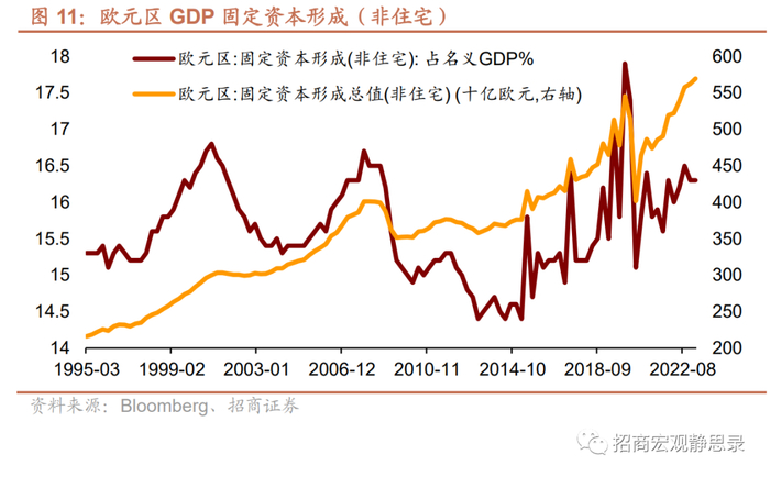欧元区制造业增加值占GDP的比重从去年以来明显提升。2023年一季度,制造业增加值占GDP比重为15.1%,前值为15.0%,去年一季度为14.6%。欧元区固定资本形成(非住宅)占名义GDP的比重在疫情中下降,2022年开始回升。2022年固定资本形成(非住宅)占名义GDP比重16.26%,较2021年提升0.35%。