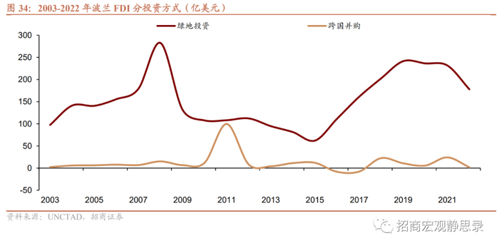 以波兰为例。从投资方式看,2016年起绿地投资金额快速、大幅增加,跨国并购金额偏低。从投资行业看,2021年FDI流入前三大行业分别是服务业、制造业和建筑业,占比分别为51.1%、36.2%、6.0%。制造业中,机械产品、金属制品、汽车占比排名前三;服务业中,专业科学和技术业、批发零售业、房地产占比排名前三。从投资来源看,波兰FDI流入以欧洲国家为主,根据波兰央行数据,2020年对波兰投资额排名前5位的国家分别是荷兰、卢森堡、德国、瑞士、塞浦路斯,占比分别为25.6%、16.7%、15.6%、7.0%、6.7%。