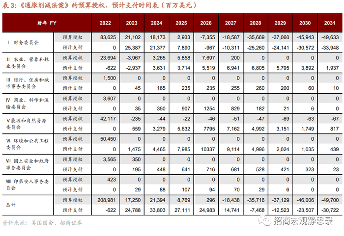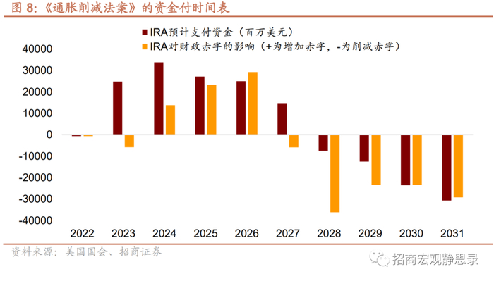 《通胀削减法案》(IRA)计划在10年内获得7390亿美元收益,其中3690亿美元用于投资能源安全与气候变化,640亿美元用于改革医疗体系,从而削减财政赤字超过3000亿美元。