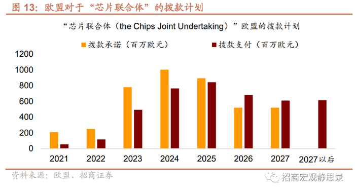 资金方面,《欧洲芯片法案》提出的430亿欧元配套投资中,只有33亿欧元是来自欧盟的直接预算,包括通过 Horizon Europe 计划提供的16.5 亿欧元和通过 Digital Europe 计划提供的 16.5 亿欧元,剩下将近400亿欧元则主要来自于各成员国的政府投资及私人投资。