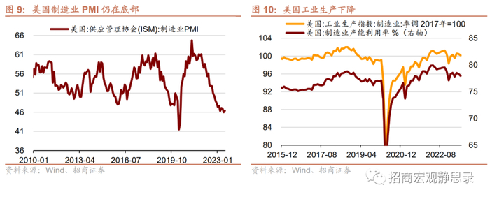 目前美国的工业生产相关指标仍较低迷,包括制造业PMI在历史低位,产能利用率边际转弱等。但鉴于前文提及的制造业投资近期迅速上升,两部重量级法案推动,同时制造业在2023年以来呈现招工热现象,制造业时薪增速显著上升,与总体时薪增速走势反向,预计美国制造业即将企稳回升。