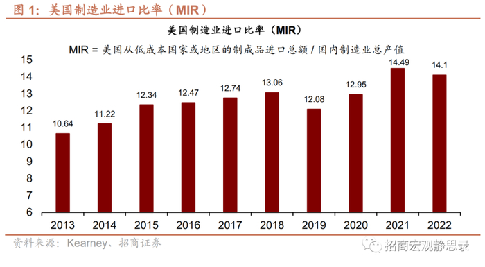 美国在2018年开始推进制造业回流的浪潮,包括当时发起中美贸易争端。2022年《芯片和科学法案》和《通胀削减法案》生效,进一步推进制造业本土化。根据科尔尼的《美国制造业回流指数》年报,2022 年,美国从低成本国家或地区进口的制成品总额占美国国内制造业总产值的比例从2021年的14.5% 下降0.3个百分点至14.1%,该比例在2019年也曾大幅下降1%。