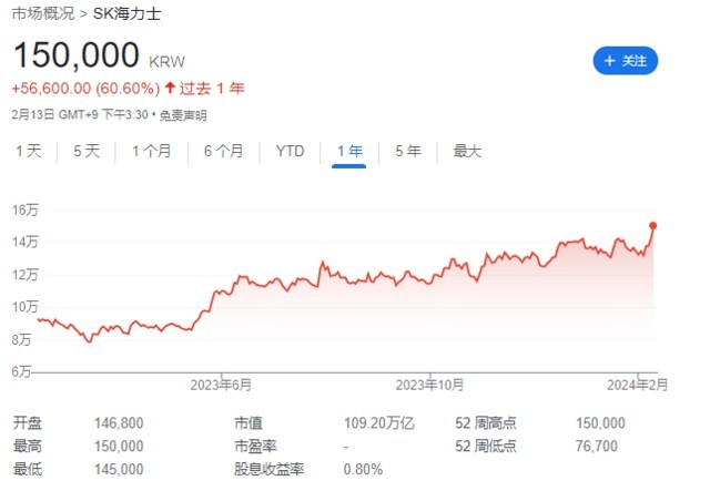 在很长一段时间内,SK海力士都是英伟达HBM的独家供应商。2023年SK海力士基本垄断了HBM3供应,今年其HBM3与HBM3E的订单也已售罄。作为英伟达HBM的主要供应商,过去一年中,SK海力士股价飙升超过60%。