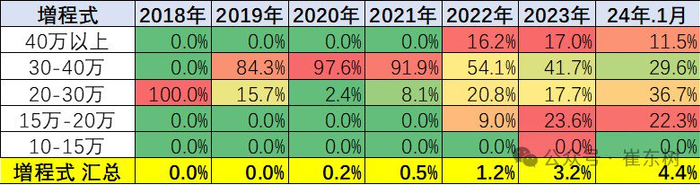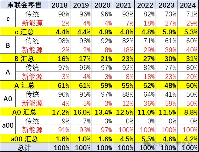 根据乘联会数据,全国乘用车市场价格段销量结构走势持续上行,高端车型销售占比提升明显,中低价车型销量占比减少,这是消费升级的推动,同时也是因为换购群体的消费升级推动。2024年进一步强化车市结构高端化特征。2024年1月乘用车市场零售较2017年峰值仍差一些。从结构分析看,入门级萎缩,消费基盘不扎实的问题较大,中低端购买力不足。传统燃油车价格段上行的现象并不是促进消费的有利因素,需要普通消费群体更强的购买入门级车消费。因此改善普通群体需求购买力,实现车市价格端相对均衡,拉动入门级消费,实现首购群体的消费升级。