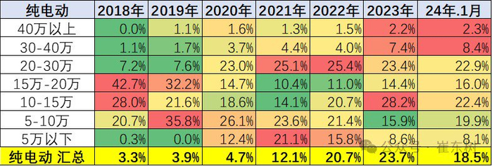 纯电动车随着成本的下降和产品提升,5万以下的电动车与20-30万元以上的电动车表现较平稳。这其中特斯拉仍列在20万以上,防止结构波动太大。