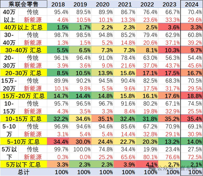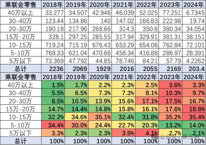 根据乘联会零售数据,全国城市市场的价格段结构走势是持续上行,高端车型销售提升明显,中低价车型销量减少。
