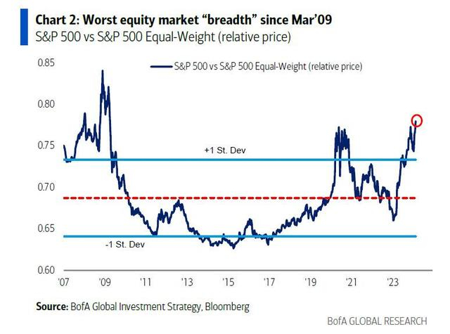 美股市值前5的股票贡献了标普500迄今75%的涨幅。而前三大市值的科技股占了科技板块迄今涨幅的90%。如下图表所示,美国股票市场的广度现在是自2009年3月以来最差的,那时标普500在雷曼兄弟破产事件后的低点大约是666。