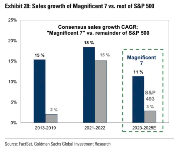 从年复合增速(CAGR)来看,从2013年到2019年“七大科技巨头”整体销售额CAGR高达15%,而其他股票的年复合增长率为2%。这一差距在2021到2022年一度收窄。但是高盛的策略师们预计,从2023年到2025年,“七大科技巨头”整体销售额的复合年增长率将达到11%,而标普500指数其他成份股的复合年增长率仅为3%。