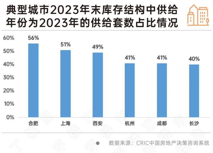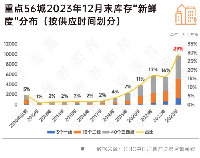 CRIC数据显示,截至2023年末,重点56城7成以上库存为2020年及以来的供应,其中2020年、2021年、2022年、2023年占所有库存的比重分别为11%、17%、16%和29%,2018年及之前的老旧库存累计占比约为19%。