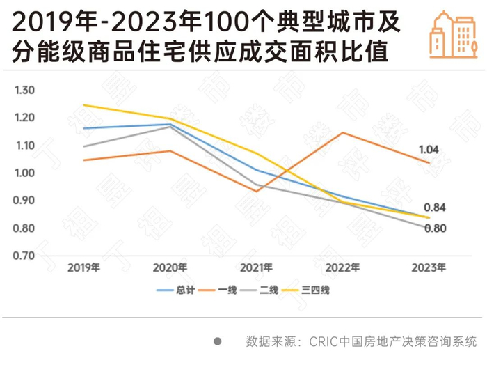因2021年以来地产行业进入深度调整期,供需两淡,百城供求比持续下降,2019年为1.16,显示市场仍然明显供过于求,2022年,供求比滑入1以内区间,并在2023年进一步0.84的阶段性低位,整体市场也由供过于求向供不应求转变,供给约束愈发明显。