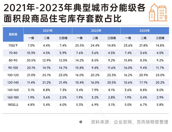分能级来看,一线、二线城市70平以下小面积产品为库存主要分布,二线、三四线城市100-120平产品为库存占比偏高。