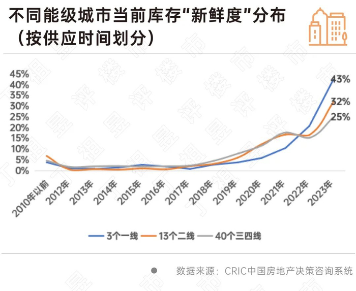 分能级城市来看,一线城市库存相对“较新”,2023年库存占比高达43%。相比之下,二三线城市库存不及一线城市新鲜,2023年库存占比分别为32%和25%。