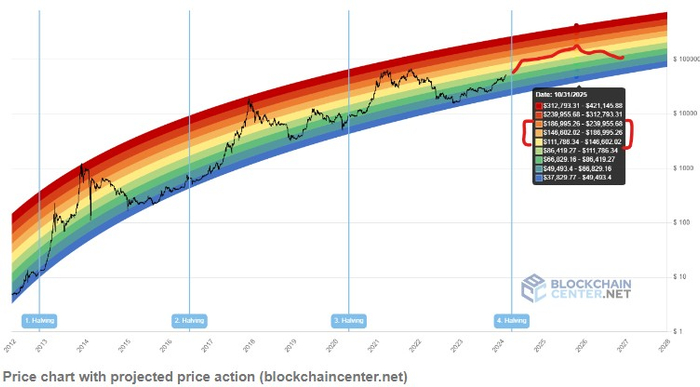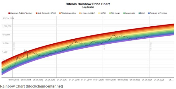 得出这一数字的另一个方法是通过彩虹图。彩色色带表示价格范围,而比特币在这个对数轨迹中的交易非常符合这些色带。