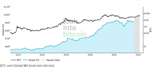比特币可以被视为全球法定货币流动性的代表。以下是比特币价格与全球M2的对比图。这两个时间序列的走势非常接近。