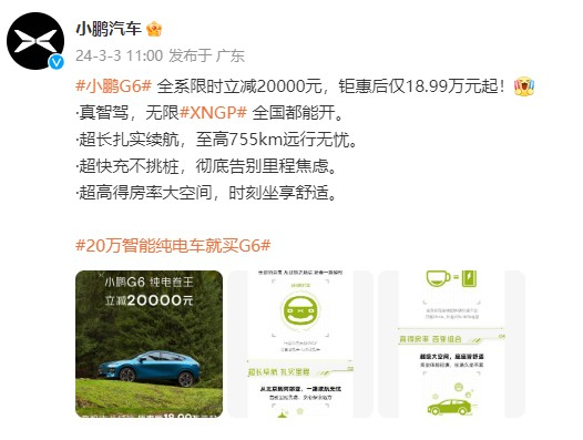 3月3日,小鹏汽车(09868)宣布,2024年3月31日前,小鹏G6全系车型限时立减2万元,优惠后售价为18.99万元起。据统计,目前已有14家车企官宣降价,包括:比亚迪、吉利、哪吒、上海大众、一汽大众、长安、奇瑞、飞凡、智己、现代、特斯拉、零跑、小鹏、埃安。