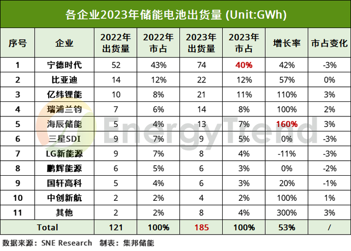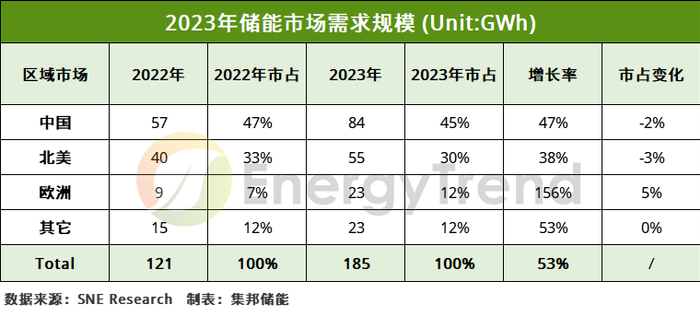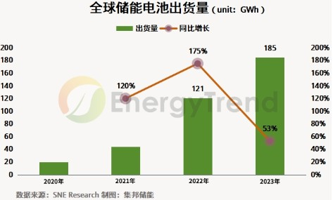 SNE Research:2023年全球储能电池的出货量185GWh 同比增长约53%