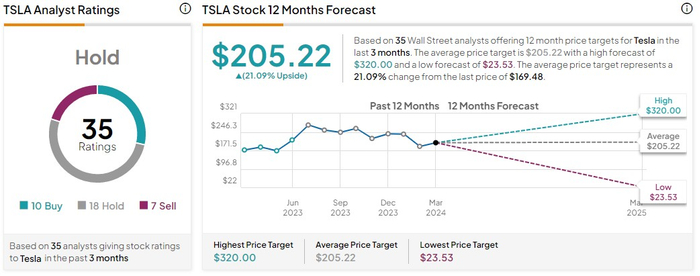 总体而言,华尔街分析师对特斯拉的看法存在分歧。根据TipRanks的数据,有10位分析师予特斯拉“买入”评级,18位予“持有”评级,7位予“卖出”评级,共识评级为“持有”,平均目标价为205.22美元,较当前水平高出21%。