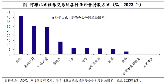 股市特征之二:外资青睐科技板块。从阿布扎比证券交易所主要上市公司外资持股比例来看,截止2023年,外资更加青睐的行业为科技、基础材料以及可选消费等,持股比例分别为41.7%、30.4%以及29.5%;房地产行业外资持股比例也有13.6%,而工业、电信、必需消费品以及能源等外资持股比例则相对较低。