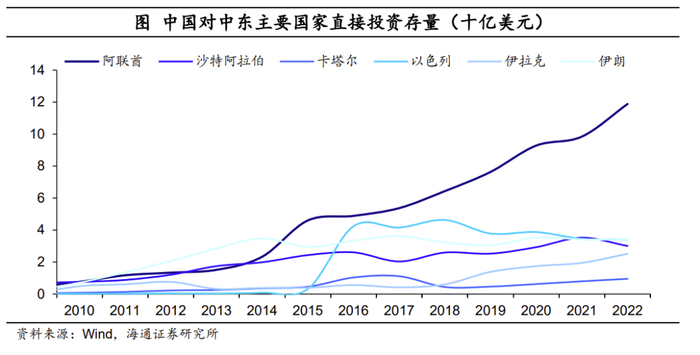 投资领域:双边合作密切,集中在能源、港口以及建材等领域。从FDI流量角度来看,自2010年以来,中国对阿联酋直接投资持续增加;从FDI存量角度来看,自2014年之后,阿联酋是中东地区中国最主要的投资国,明显领先于其他中东经济体。