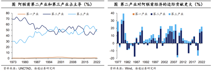 从产业结构来看,阿联酋以第二、第三产为主。我们在此前的报告《中东:“油库”中的机遇——新兴经济研究系列之七》中指出,受水资源和可耕种土地稀缺等因素影响,中东地区在产业发展过程中并未经历由农业向工业与服务业转型的过程,一直以第二、第三产业为主。