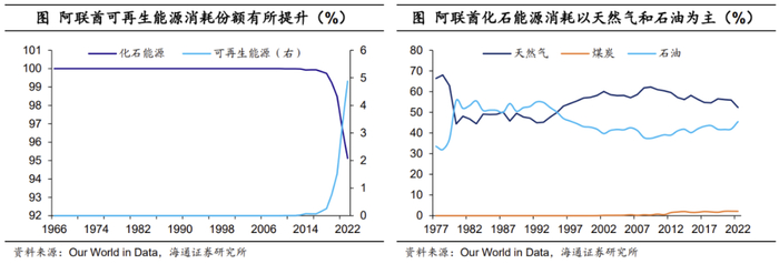阿联酋多元化转型颇有成果。从能源结构来看,可再生能源消耗份额提升明显。2009年之前,阿联酋能源消耗均是化石能源提供,自2010年开始可再生能源有所表现,尤其是2017年之后加速提升。截至2022年,可再生能源消耗份额提升至4.9%,可再生能源以核能和太阳能为主,尤其是核能贡献更多。进一步来看,化石能源以天然气和石油为主,尤其是从1996年之后,更多以消耗天然气为主,相对来说也比石油更加清洁。