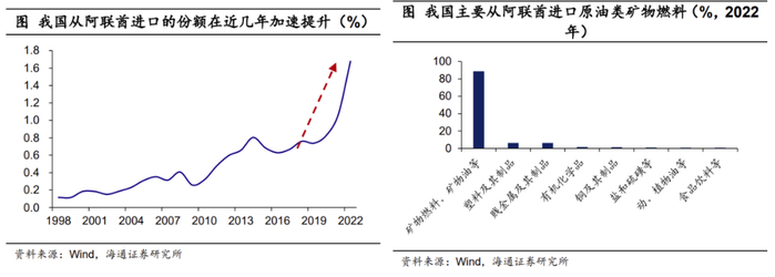 另一方面,截至2022年,我国从阿联酋进口商品454.2亿美元,占我国总进口的份额上升至1.7%,较2021年提升了约0.6个百分点(在2010年之前,这一比重不足0.5%)。进一步来看,我国最主要从阿联酋进口原油类矿物燃料产品,阿联酋是我国第四大原油进口来源国。
