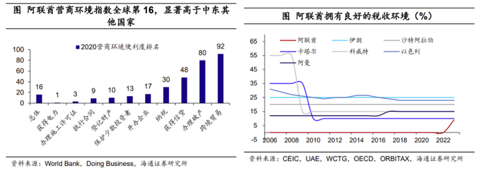 阿联酋能在多元化转型方面取得成果,并领先中东其他经济体,与多方面因素有关。其一,与阿联酋政府积极推动对外开放,经济自由化程度较高有关。例如,截至2023年底,阿联酋共有46个自由贸易区,在自贸区内实行特殊的税收优惠、资本汇回和外商持股比例政策,以促进商品和服务交易。其二,与阿联酋整体营商环境位于全球前列水平有关。例如,截至2020年,阿联酋营商便利度指数位于全球第16,高于中东其他经济体。其三,与阿联酋良好的低税收环境有关。例如,2023年6月开始,阿联酋政府才首次征收企业所得税,且9%的企业所得税率与中东其他国家相比也处于较低水平。
