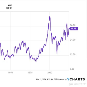 回溯至1871年,标普500指数的席勒市盈率平均为17.1倍,不算高。截至2024年3月20日收盘,标普500指数的席勒市盈率略低于35倍。这是牛市期间最高的倍数之一。
