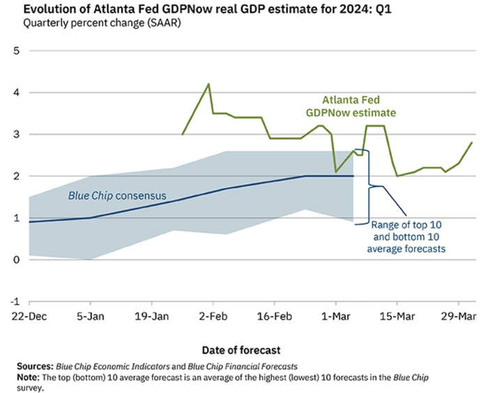 最新公布的超过50荣枯线的制造业PMI数据,加之强劲的美国GDP增速、劳动力数据和持平于预期的2月核心PCE数据,意味着美国经济衰退的可能性大幅降息,美联储心心念念的“美国经济软着陆”这一愿景接近达成。亚特兰大联储GDPNow模型预计,美国2024年第一季度的实际GDP增长率约为2.8%,2023年第四季度美国GDP增速终值则为3.4%。