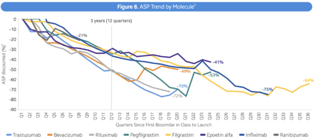 安维汀和美罗华的生物类似药在2020年底就已实现与原研药并驾齐驱。阿柏西普的2个生物类似药Byooviz和Cimerli也已占据41%的市场,不过出人意料的是,尽管Cimerli的药品支付标准金额(ASP)更高,但其份额正在快速提升。