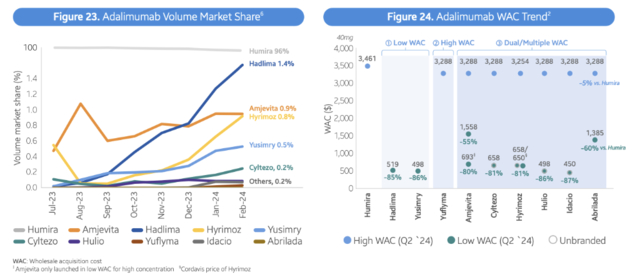 更具体地,截至今年2月,这些生物类似药的市占率仅从上一季度的2%小幅提升至4%。艾伯维凭借多年累积的医生和患者用药习惯,以及对药品福利管理公司(PBM)的大幅回扣,仍牢牢把控着阿达木单抗的市场。