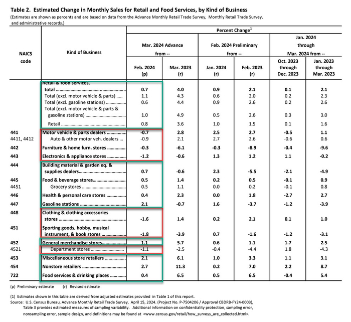 13个类别中有8个类别出现了增长,其中以电子商务为首。由于价格上涨,加油站的销售额增加,而服装商店、家具、电器和消费电子产品以及汽车销售额下降。作为经济晴雨表的餐饮业销售额也增长了0.4%——因为当经济健康,美国人对工作有安全感时,餐馆的销售额往往会上升,这是报告中唯一的服务业类别。