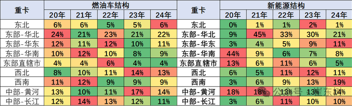 燃油中重型卡车在中部黄河地区市场和华北市场份额较高。而新能源重卡在华东地区和西南地区表现较好,份额提升,但在华北地区下降相对明显。