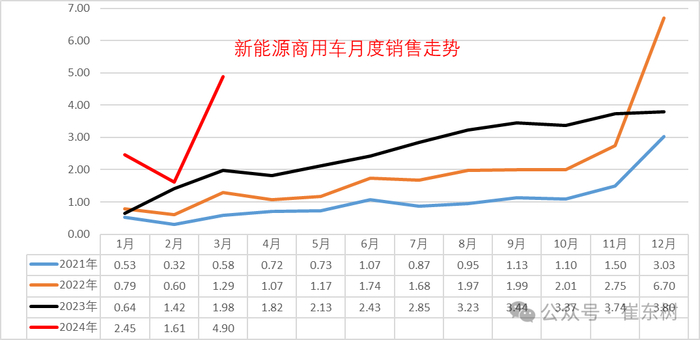 2023年新能源商用车整体呈现1-3月份因补贴退出的影响形成低位,5-12月份又呈现强势增长的特征。2024年1-2月份回归正常月度走势,3月节后开局也呈现了波动发展的较好增长局面。