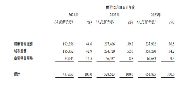 截至2023年12月31日止年度,公司在管物业管理项目总数为68个,在管建筑面积为11.1百万平方米,城市服务板块在管项目总数为157个,包括4个照明系统运营项目、150个停车场运营项目及3个市政环卫项目;同期公司亦完成了85个园林绿化及工程项目,截至2023年12月31日有87个在建项目。截至2023年12月31日止年度,商业运营服务板块在管项目总数为50个,在管建筑面积为76.6万平方米。