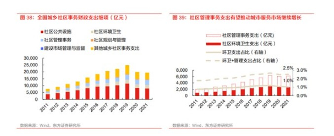 东方证券研报显示,当前城市服务市场空间广阔,狭义上看,2021 年城乡社区环境卫生支出 2521 亿,占全部财政支出比例 1.0%,该比例 20 年以前稳中有增,20-21 年有所下降,目前环卫订单并非全部释放到市场,预计城服覆盖率会持续提升。广义上看,随着城市运营管理的职能逐步从政府部门转移至市场化机构,社区管理事务支出将有望推动城市服务市场继续增长,21年城乡社区环境卫生+管理事务支出共 6189 亿元,占全部财政支出比例 2.5%。