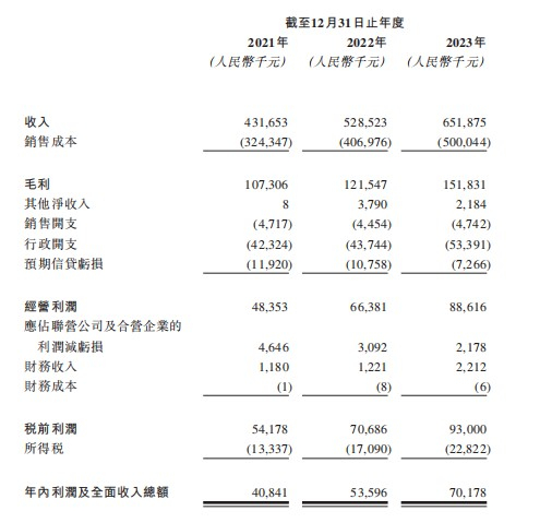 得益于业务增长,泓盈服务的业绩稳中有进。2021年至2023年(以下简称:报告期内),公司营收分别为4.32亿元、5.29亿元及6.52亿元,年复合增长率为22.9%;同期的年内利润为4084.1万元、5359.6万元及7017.8万元;年复合增长率为31.1%。