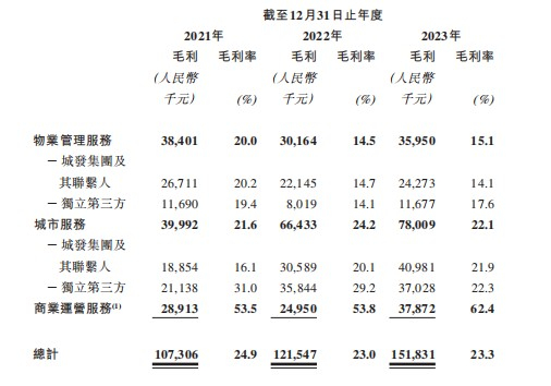 值得关注的是,随着业务规模的增长,泓盈服务的利润表现并不亮眼,甚至出现下降态势。期内,公司的综合毛利率分别为24.9%、23%及23.3%。其中增速最快的城市服务业务的毛利率分别为21.6%、24.2%及22.1%,毛利率整体较为波动。老牌物业管理服务毛利率下降明显,期内分别为20%、14.5%及15.2%。