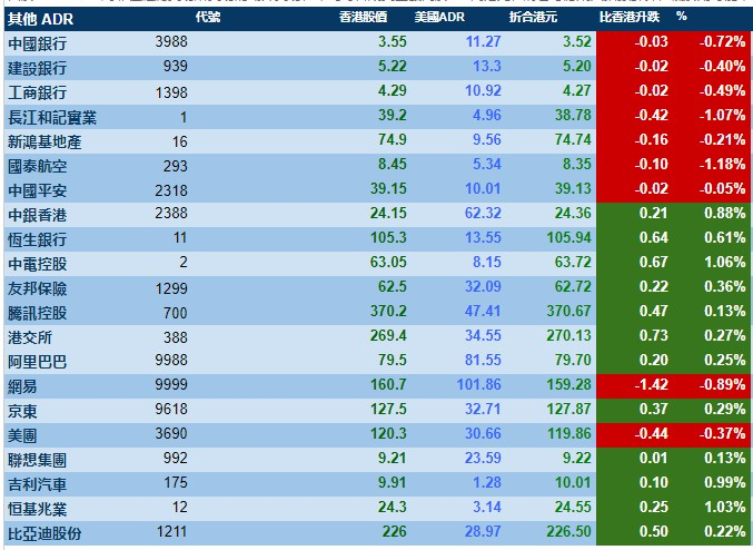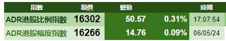 周一美股三大指数全线上涨,港股ADR指数上涨,按比例计算,收报16302点,较香港收市升50.57点或0.31%。