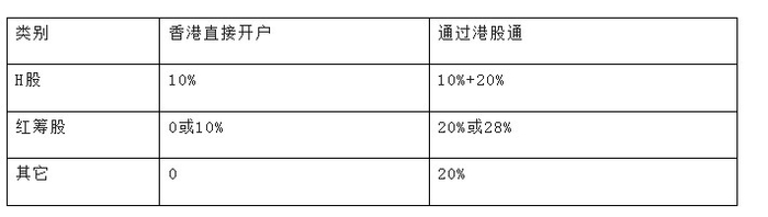 下表是香港直接开户和通过港股通两种方式下,红利税缴纳及税率情况对比: