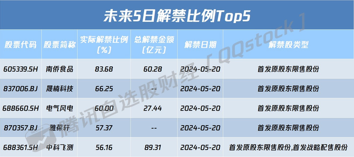 从解禁比例来看,未来5日南侨食品实际解禁比例达83.68%,其次解禁比例居前的分别为晟楠科技、电气风电。